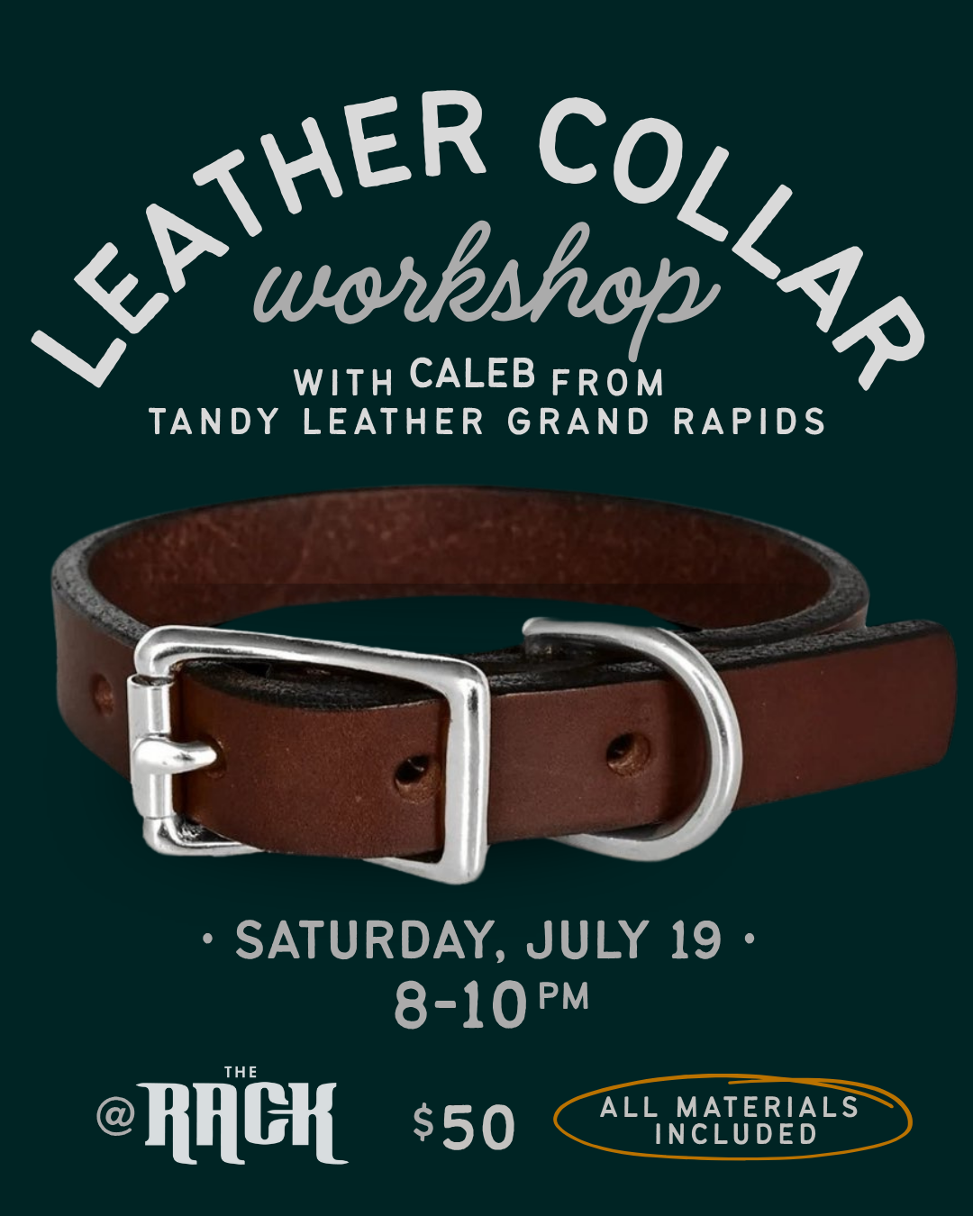 In this beginner-friendly workshop, you’ll customize your own leather collar for fashion or for play! We’ll be joined by Caleb from Tandy Leather Grand Rapids to walk you through each step of the process until you have a collar that’s uniquely yours.